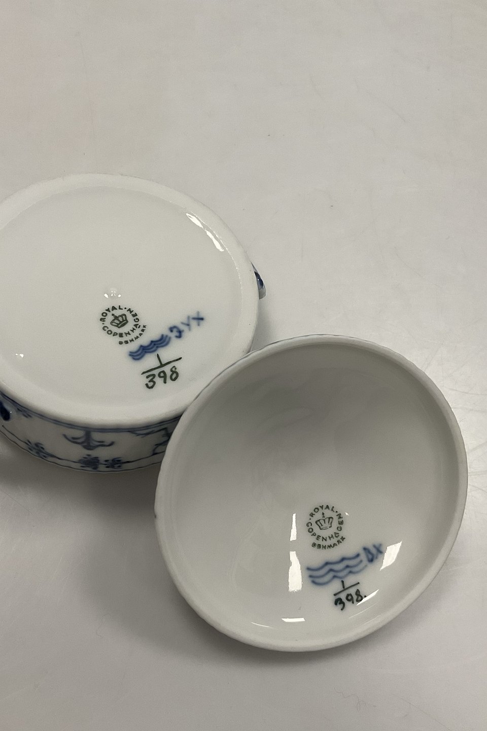 Royal Copenhagen Musselmalet Riflet Smørskål med Låg No. 398. Måler 8,5 cm x 6,5 cm (3 11/32 in. x 2 9/16 in.)Lager: 1