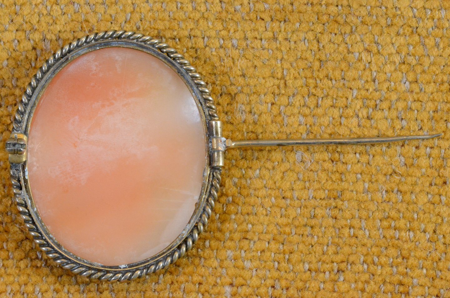 Camé damehoved med blomster i håret skåret af konkylie, monteret i sølvramme omgivet af snoet bånd. Camé broche. Str.: 4,0 * 3,0 cm. Art No. 26 Udstiller
