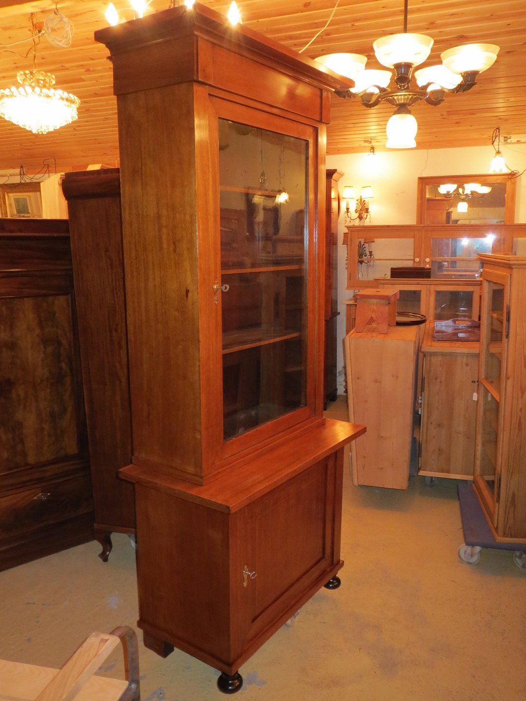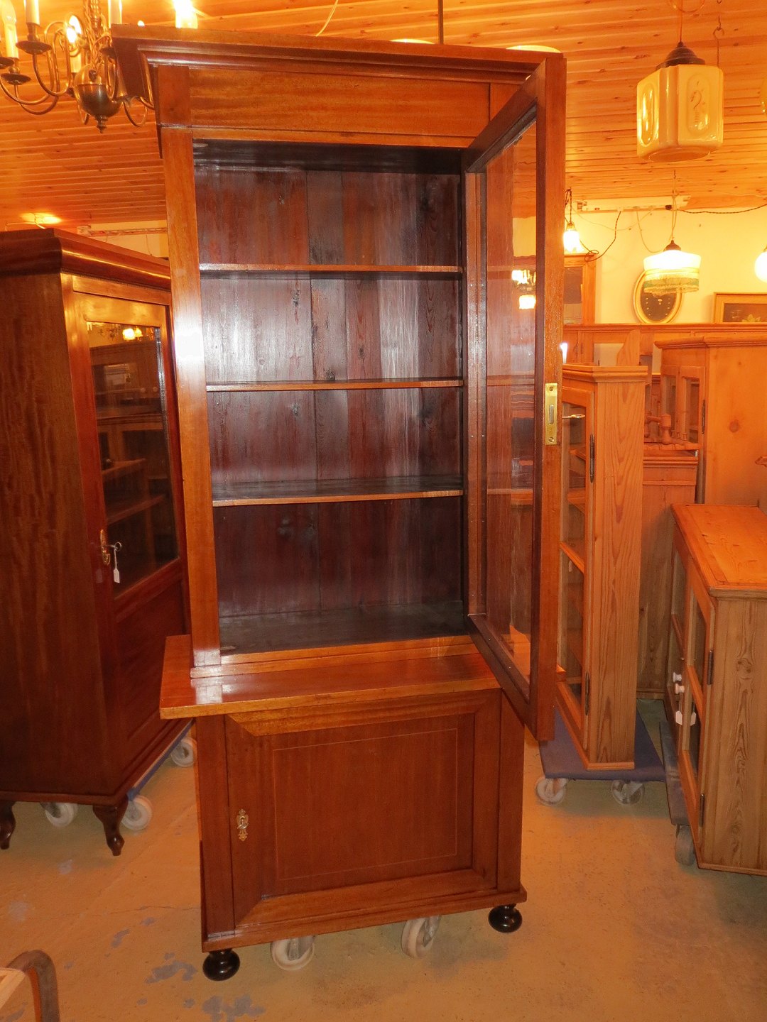 Mahogni Bogskab med 1 glaslåge 1 fast låge og flytbare hylder . Restaureret og håndpoleret mål H 185, B 84, D overskab 36, underskab 43,cm 2110/14-P Udstiller