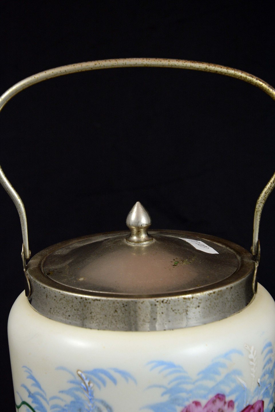 Opalglas kagekrukke med pink blomst. Krukken er lavet i råhvidt glas og låget er fremstillet i sølvbelagt metal.Højde 17,5 cm. Diameter 10,5 cm