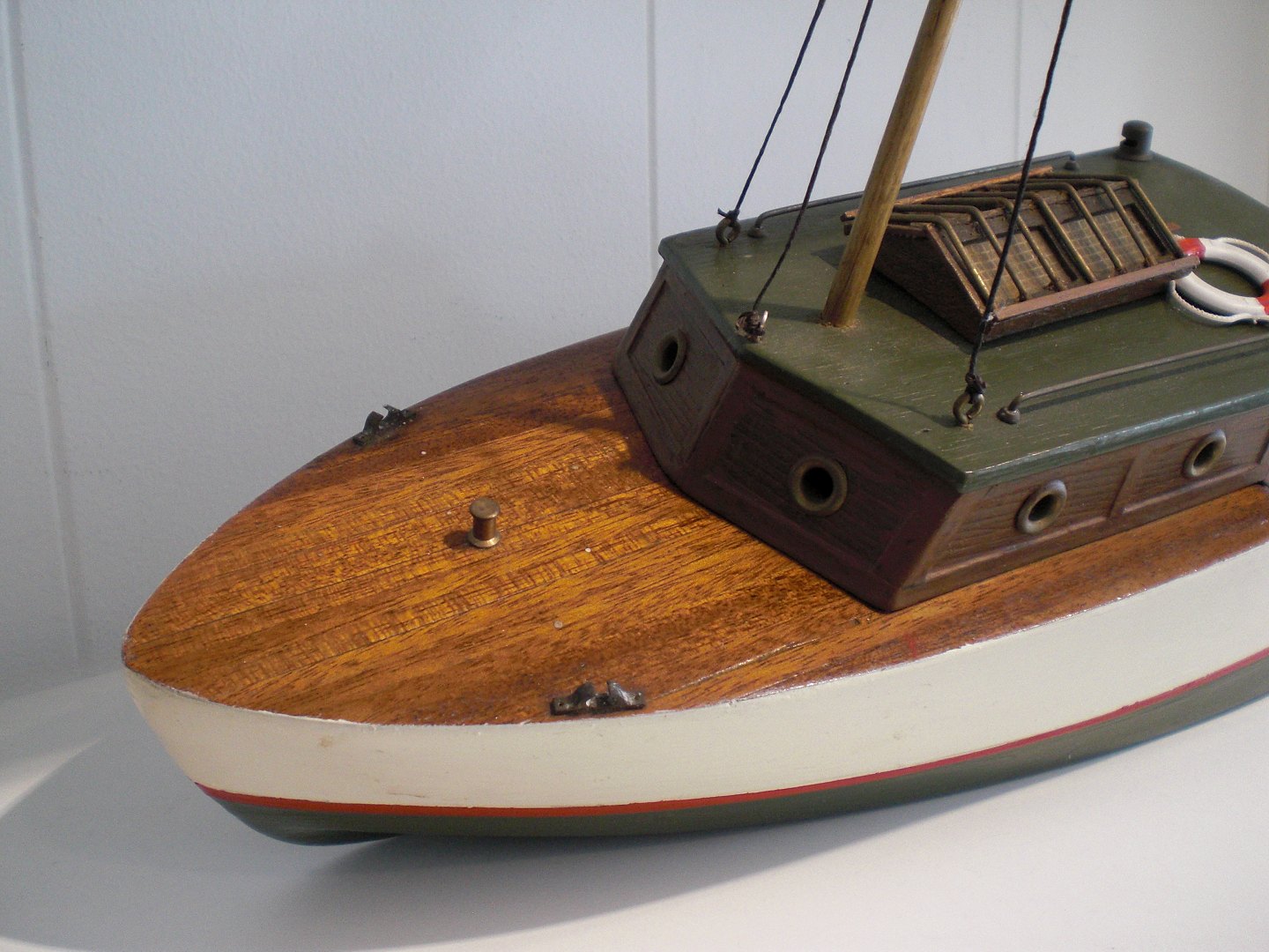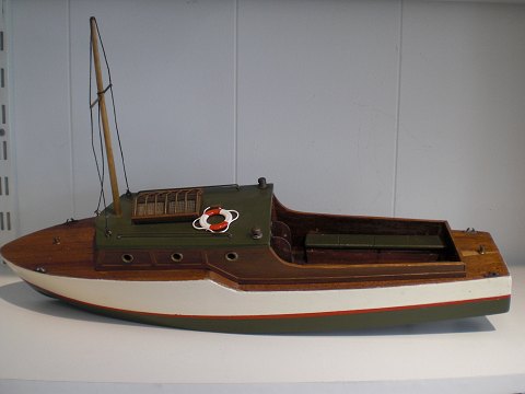 Håndbygget model af motorbåd med mahognifineret dæk, med kort mast og indenbords motor (ingen garanti for funktionalitet, skrue mangler): har været brugt til sejllads. Formentlig fra 1950-erne. Pænt detaljeret. Fremstår ibrugsstand. På primitiv stand. Samlet højde med stand: 37 cm. Længde: 50 cm. Udstiller