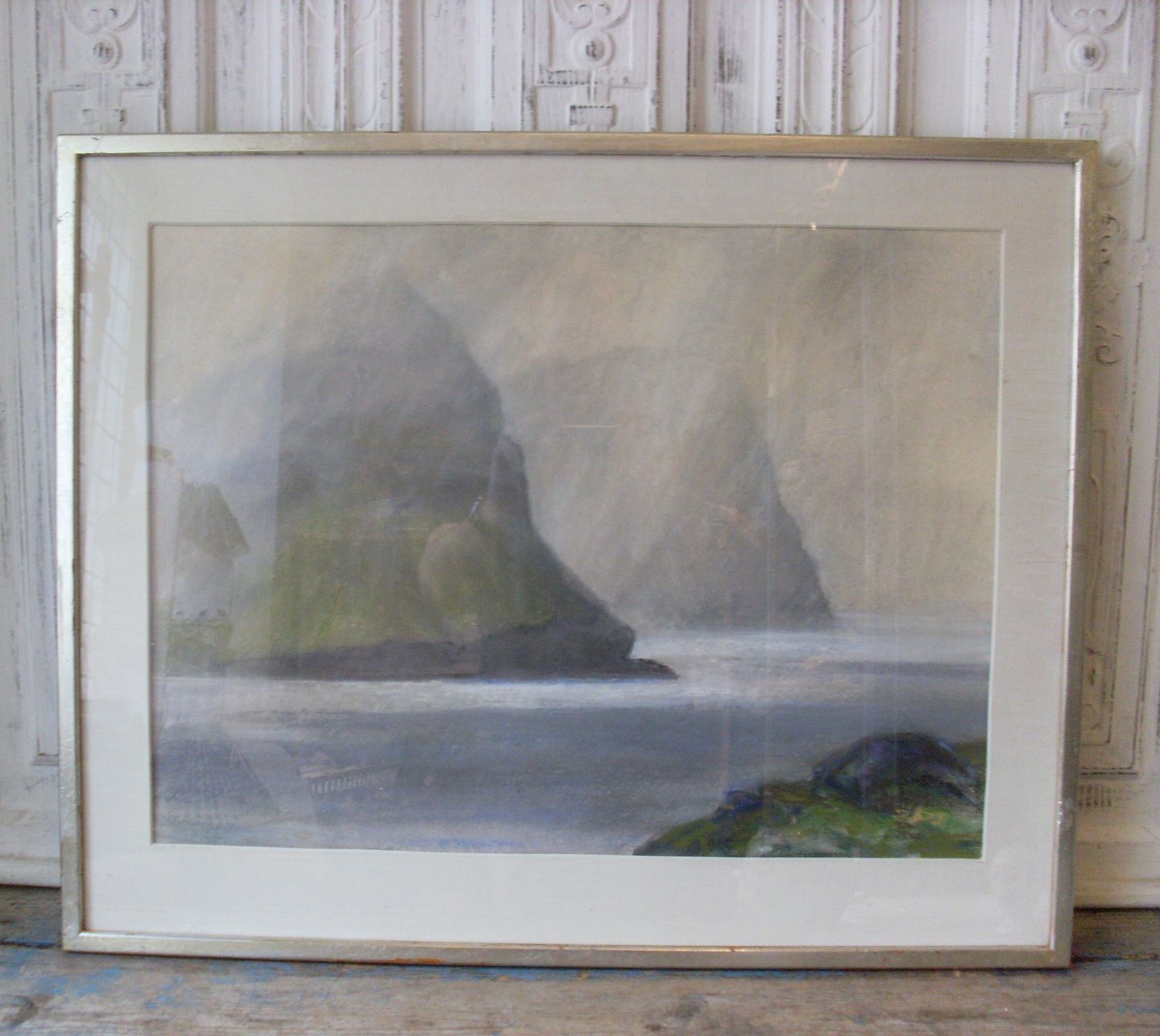 Edith Dueholm Jessen, oliekridt på papir, klippekyst fra Færøerne.Mål inkl ramme 59x72cm.