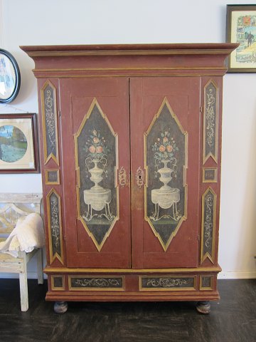 Barokskab fra Sønderjylland, år 1744 (fremgår af bemalingen).Skabet er afdækket af professionel konservator til bemalingen fra ca. 1780, dog fremstår 4 felter med original bemaling og datering fra 1744.