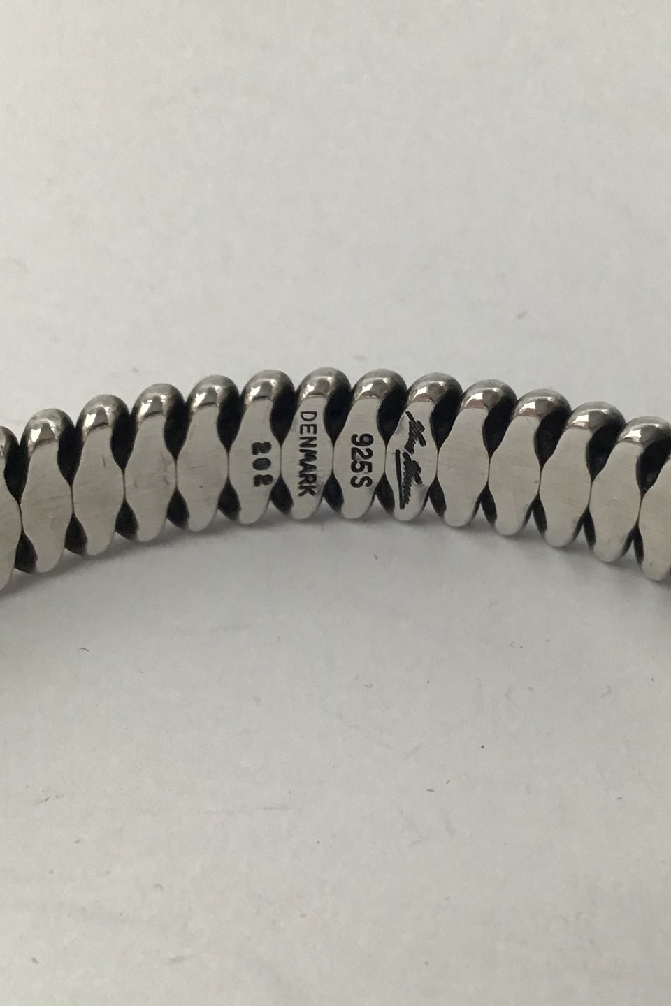 Hans Hansen Sterling Sølv Armbånd No. 202. Måler Diam. indvendigt 6 cm (2.36 inch) Bredde 1 cm (0.39 inch) Vægt 45.2 gr (1.59 oz)Lager: 1