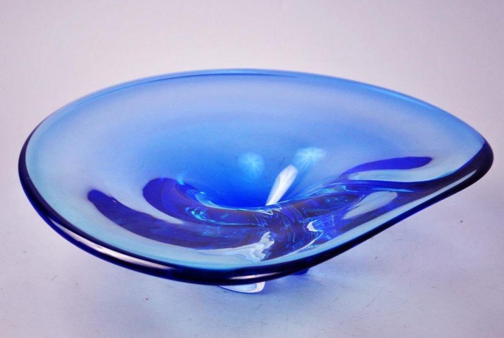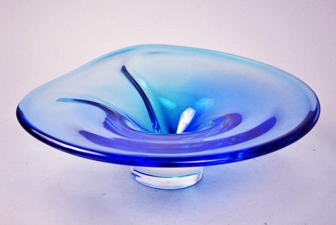 Stort blåt design glas fad, 1960'erne. Længde.: 38 cm. B.: 31 cm. Højde.: 10 cm.Emne nummer: 16703