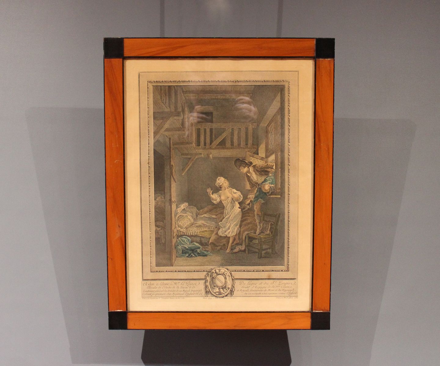 Gravering med fint motiv i to farvet træramme, i flot stand.45x35 cm.