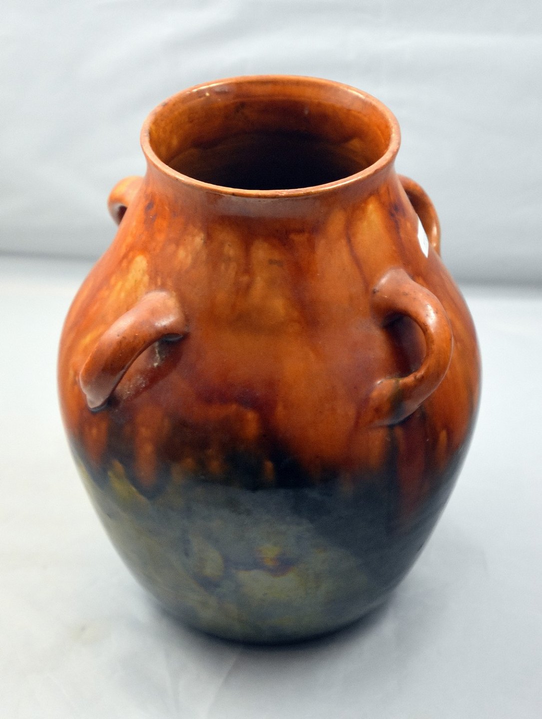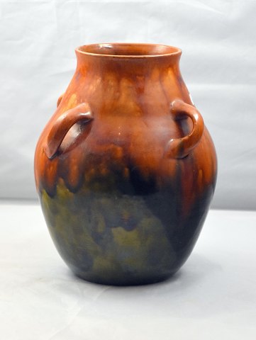 Ler vase med 4 hanke. Den har brun og grøn glassur.Den er formentlig dansk fremstillet.
