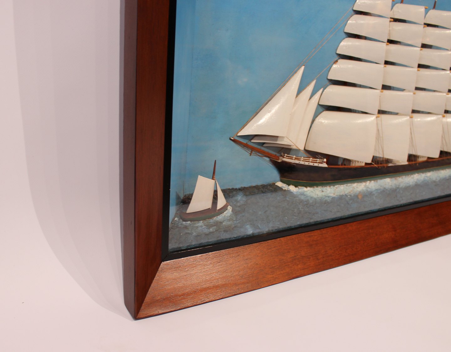 Flot dekoreret halvskib i mørk træramme fra omkring 1930erne.H - 60 cm, B - 96 cm og D - 11 cm.