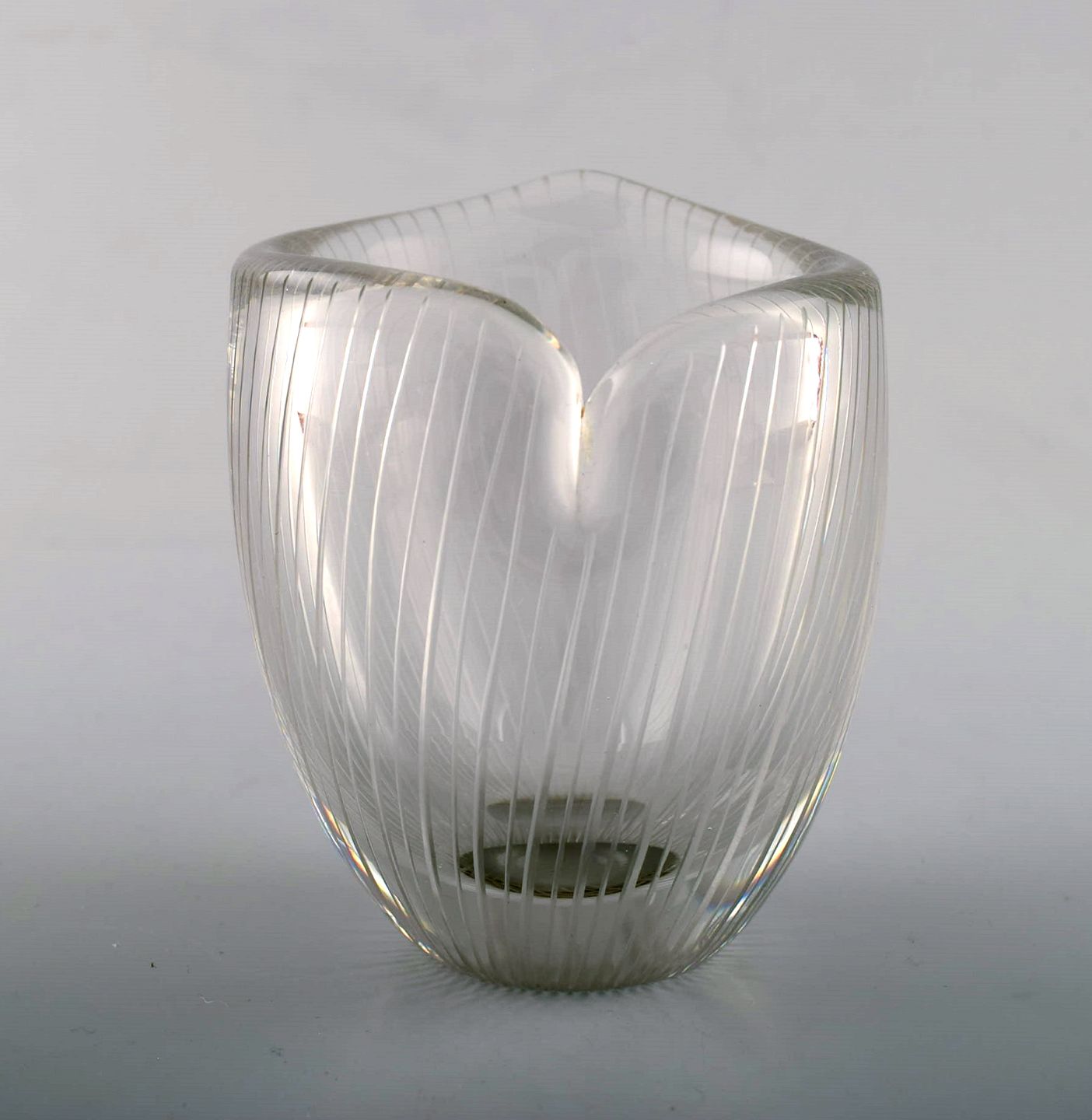 Tapio Wirkkala for Iittala.Klar kunstglas vase med indgraveret dekoration i form af striber.