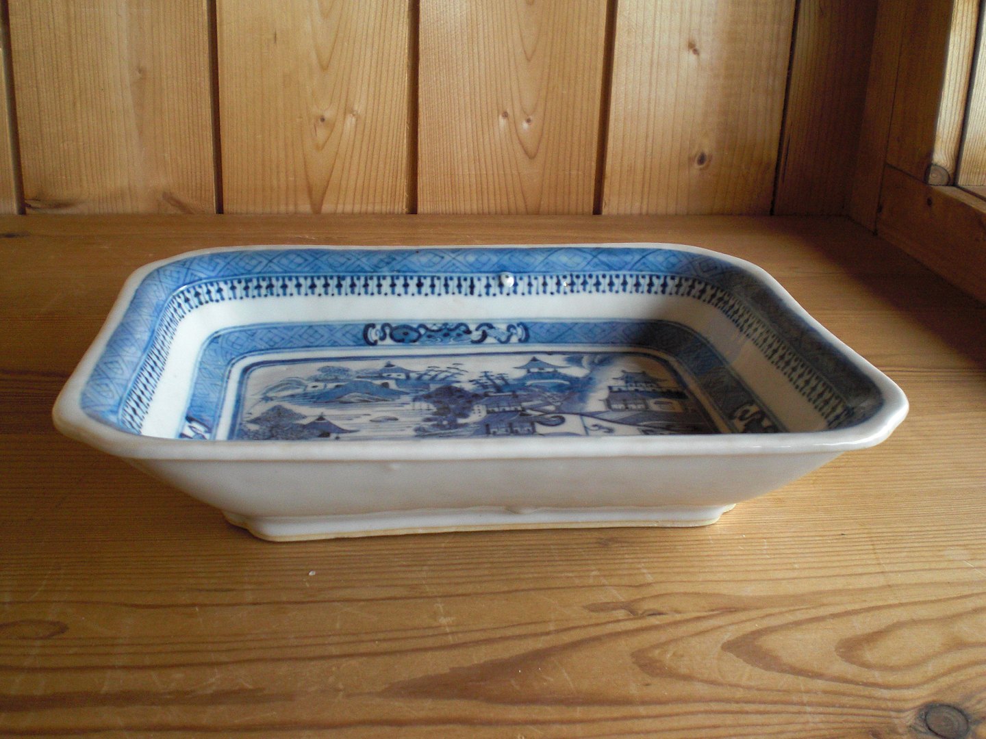 Firkantet kinesisk skål med blå underglasur -"Willow mønster" - begyndelsen af 1800 - tallet. Mål: 23 x 17,2 x 4,5 cm. I fin stand Dealer
