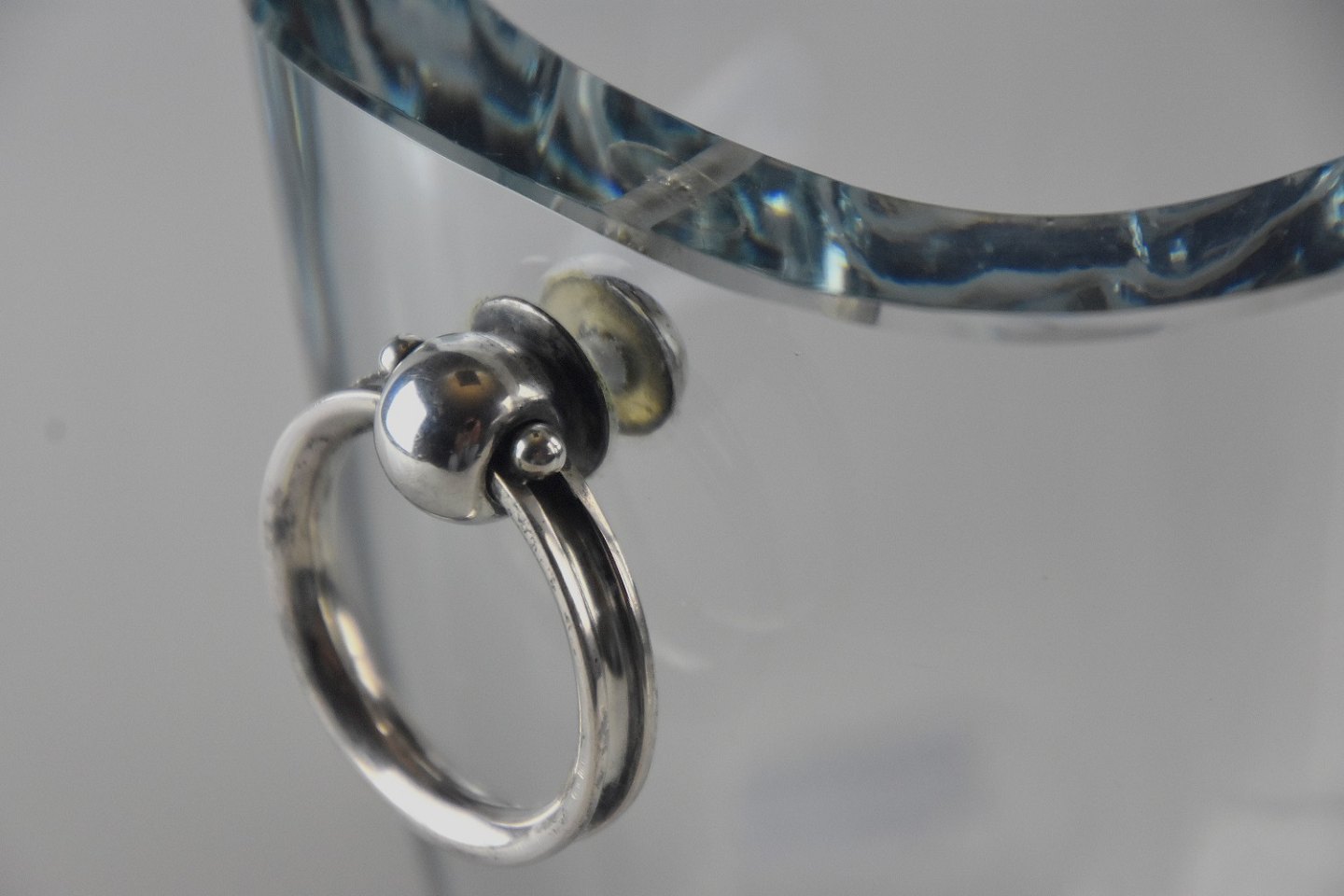Holmgaard isspand i tykt blåligt glas, isspanden har 2 ringe som hanke. Hanken er sterling sølvIsspandens mål H.: 12cm B.: 10,5 L.: 12cm