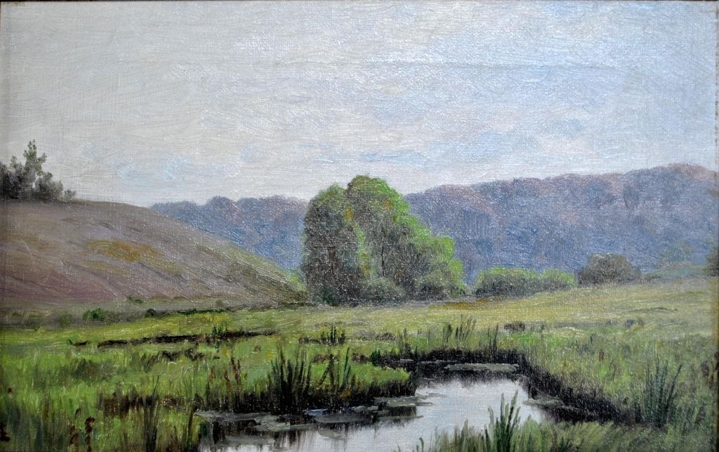 Dansk kunstner (19. årh.): Et åløb. Olie på lærred. Verso signeret: Carl Rasmussen. 19 x 29,5 cm.Indrammet.