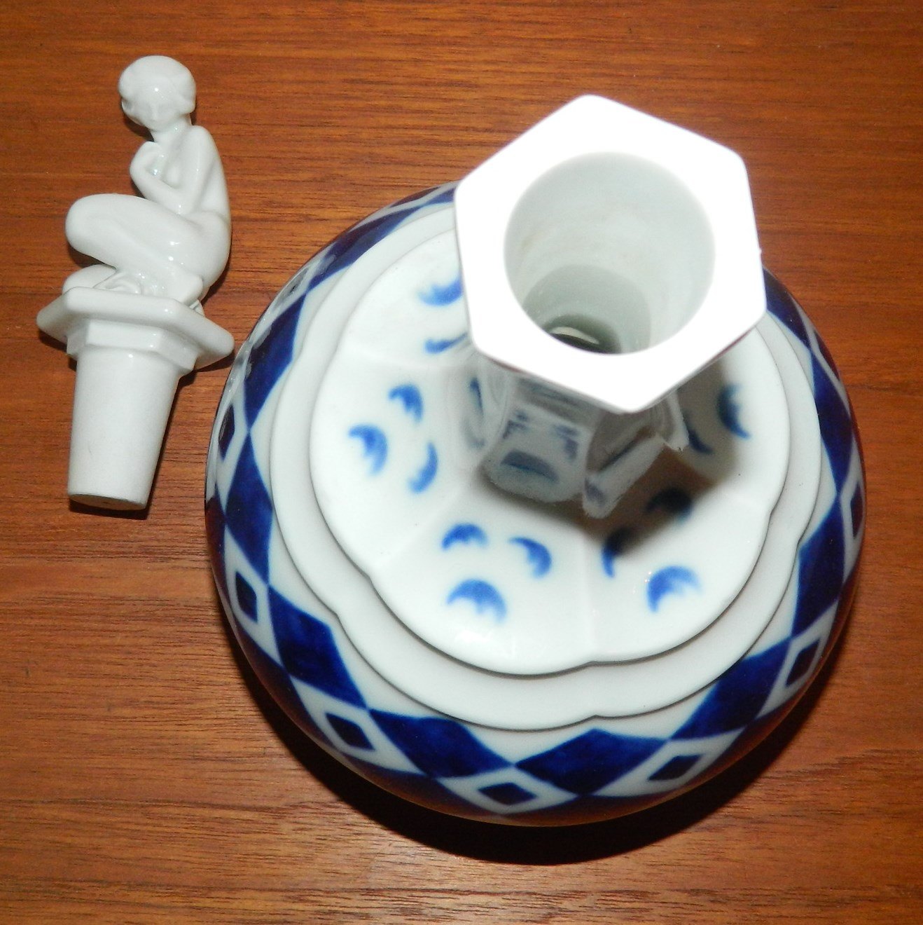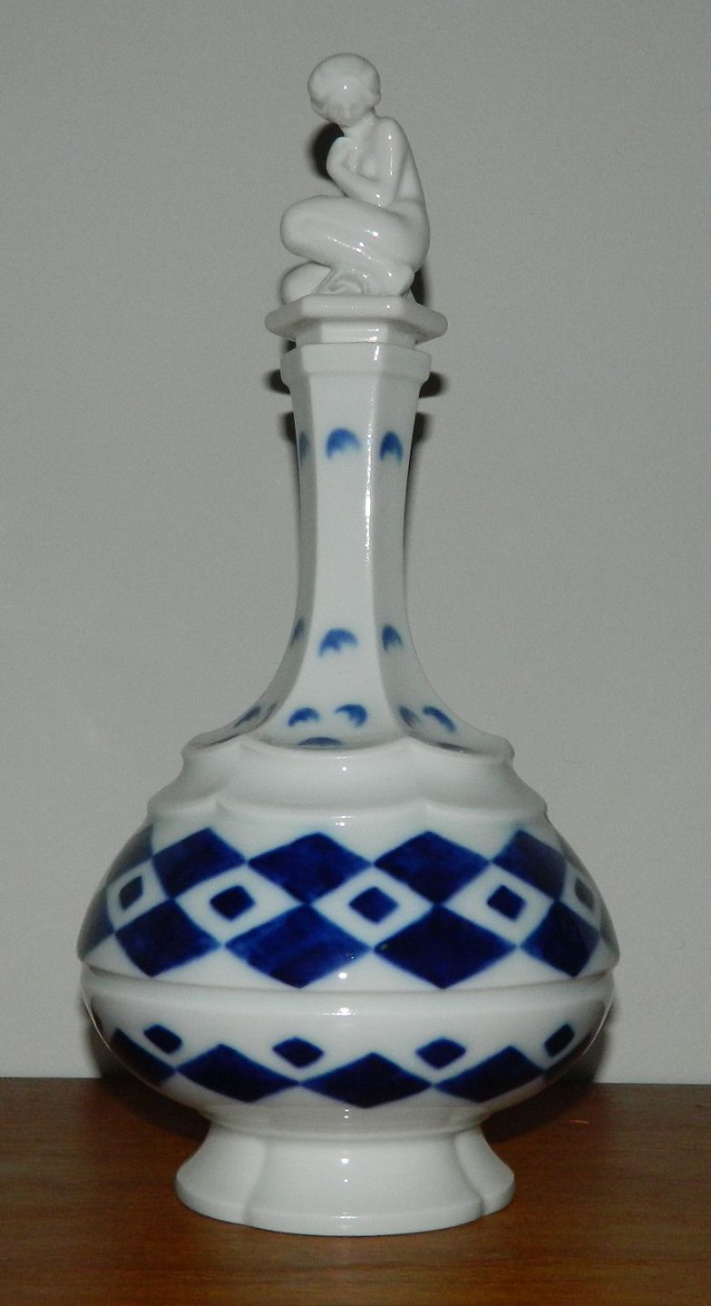 Karaffel på fod med blå ruderdekoration. På toppen en prop i form af figur af siddende nøgen kvinde. Udført af Ingeborg Skrydstrup for Bing & Grøndahl omkring 1920. I perfekt stand. 1. sortering. Fabriksmærket på bunden sammen med kunstnersignatur. Højde incl. prop 31 cm.v/ Jesper Reutemann