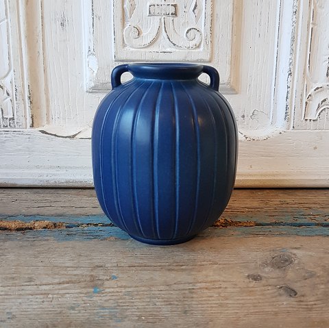 Ipsens enke riflet vase med blå glasur.Højde 14 cm.