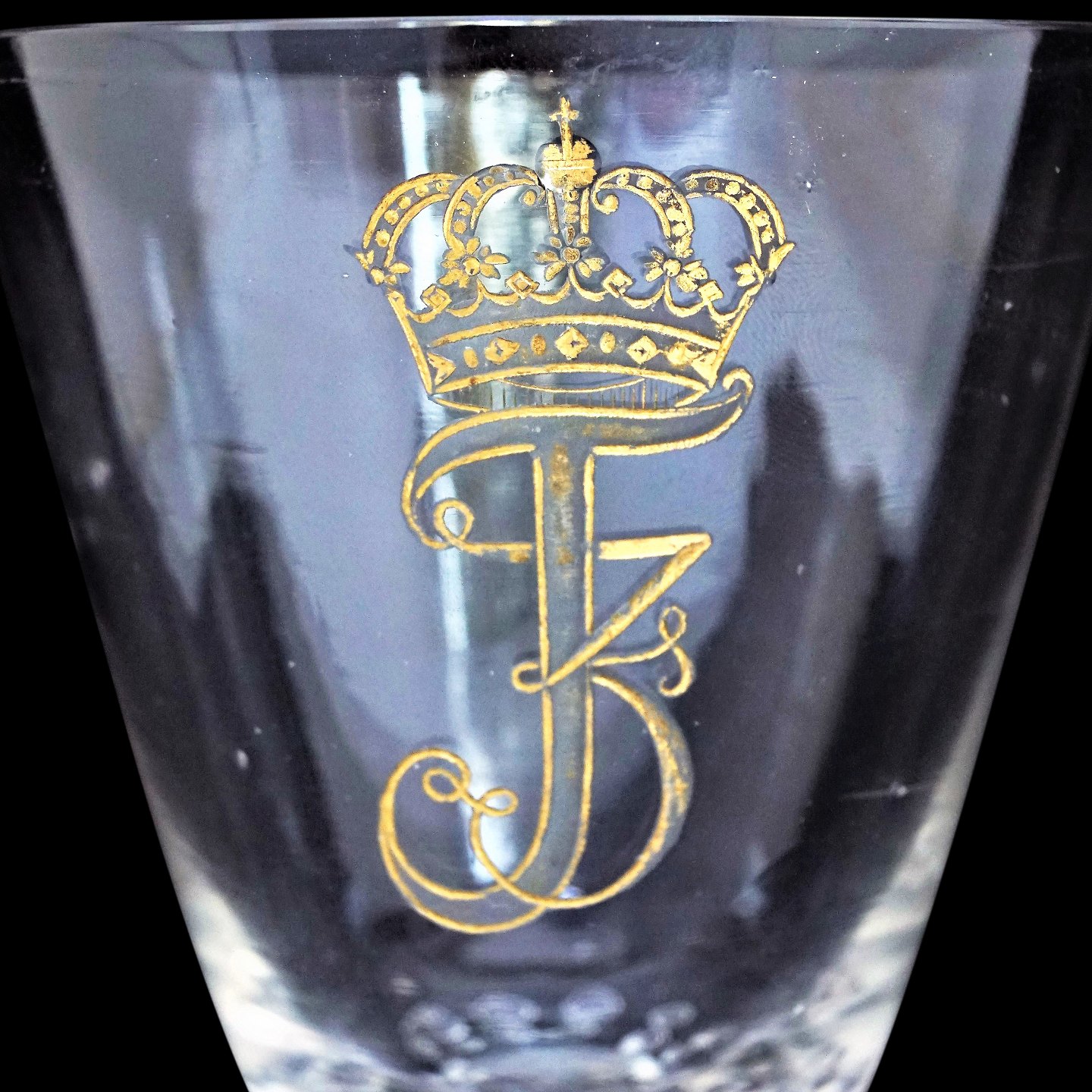 Large beautiful 18th century wineglass with royal crowned monogram in gold and air bubbles in the stem. Made on the glasswork Nøstetangen in Norway and called ¨Kongeligt mundglas ¨ in the original listing Dealer
