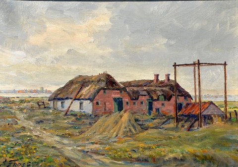 Frost, Sergius (1900 - 1994) Danmark: En gård, Klegod. Holmsland Klit. Signeret. Olie på lærred. 33 x 45 cm.Indrammet.