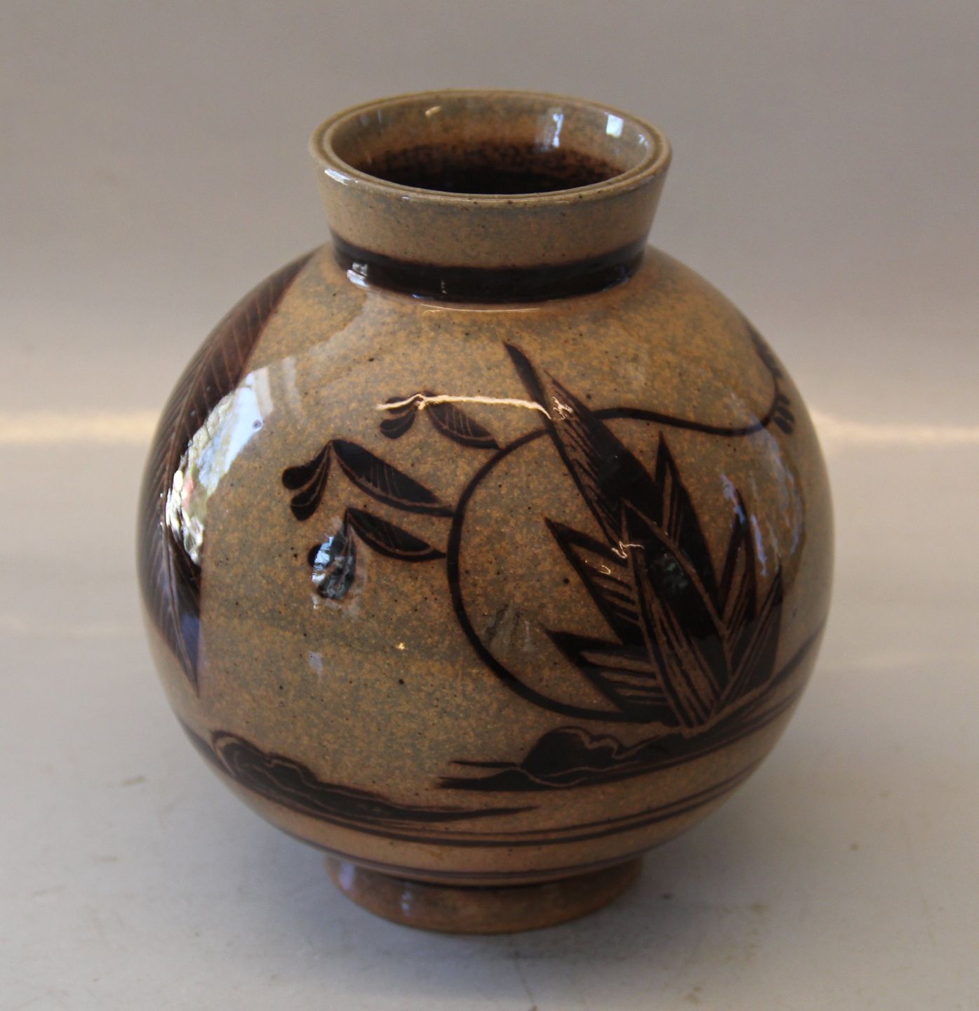 5034-5029 Aluminia Jungleserien 1932 Kuglevase 17 cm "Spidse Palmeblade på Øe" Nils Thorsson Royal Copenhagen Aluminia stentøj I fin og hel standFuglsangsgade 4