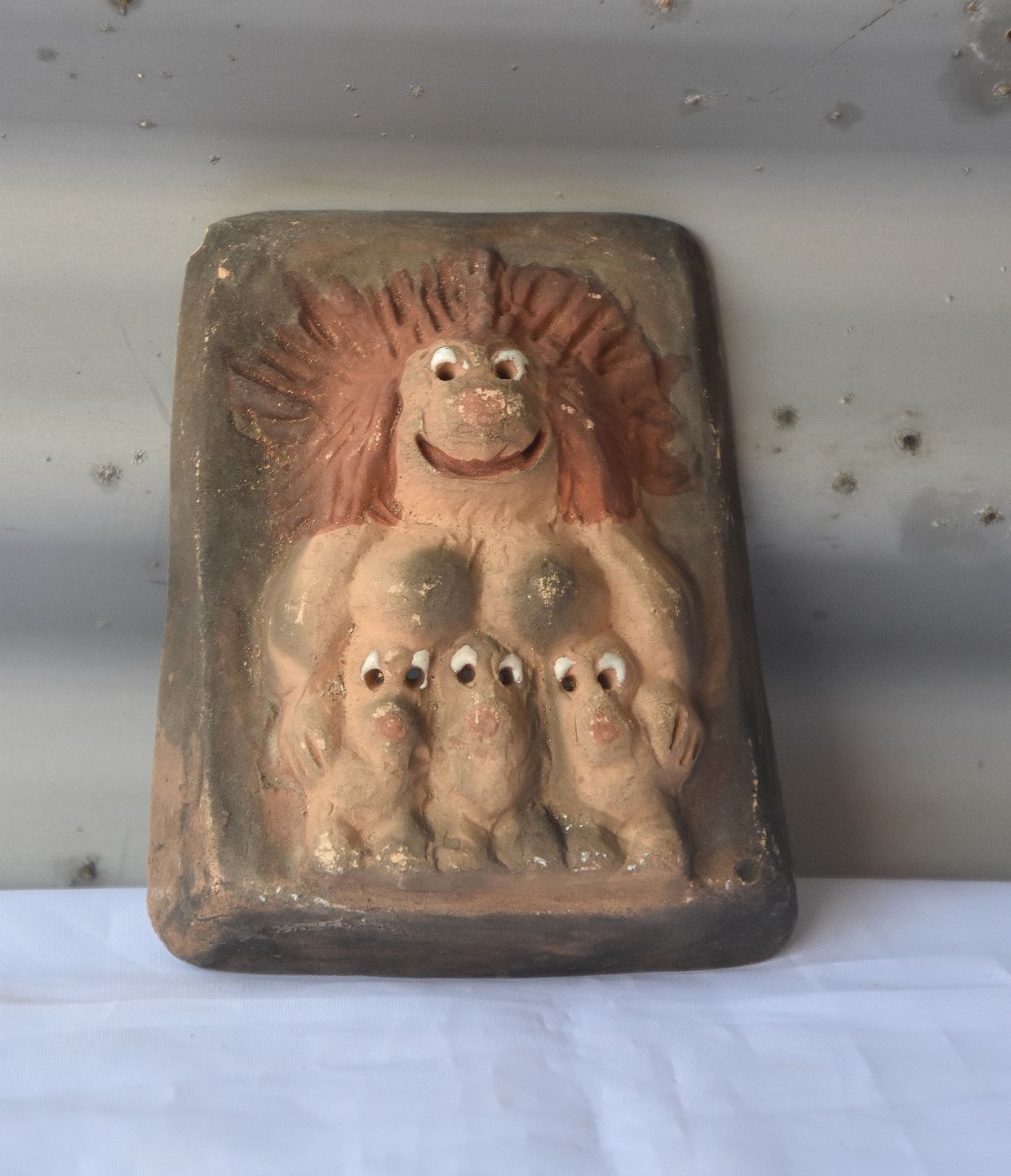 Troldedame med 3 hunde på brun baggrundDesign Aalborg kunstner Henning Knudsen