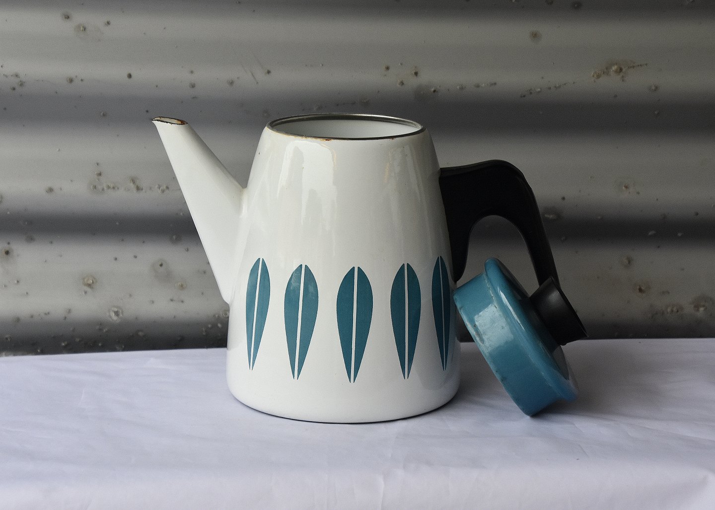 Lotus Kaffekande, hvid med blå blade og hvid baggrund, låget er også blåt. kaffekanden er emaljeret.Produceret: Katrineholm