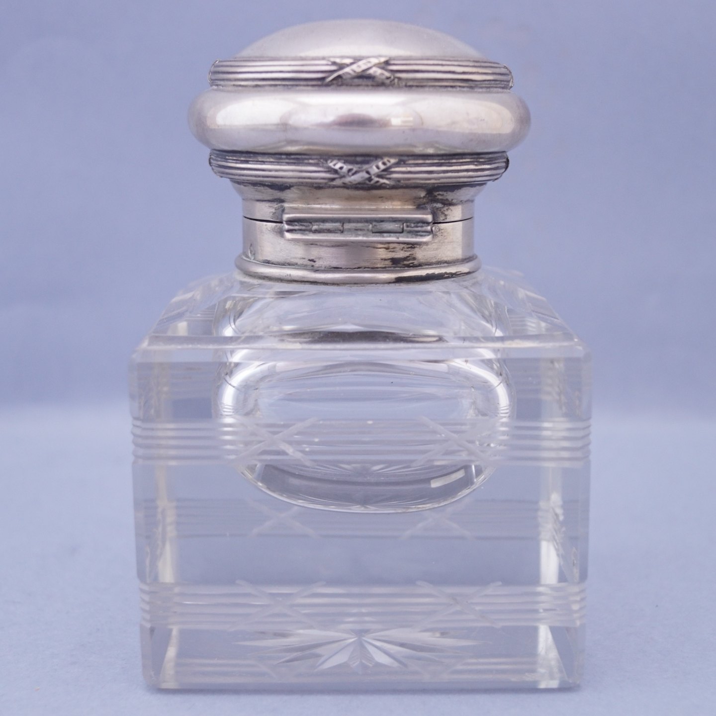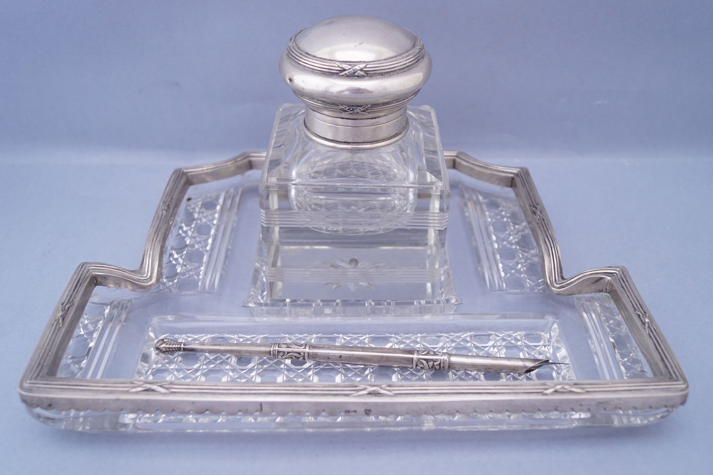 Tysk skrivesæt i krystal og sølv.Bakke: B. 21 cm. L. 27,5 cm.