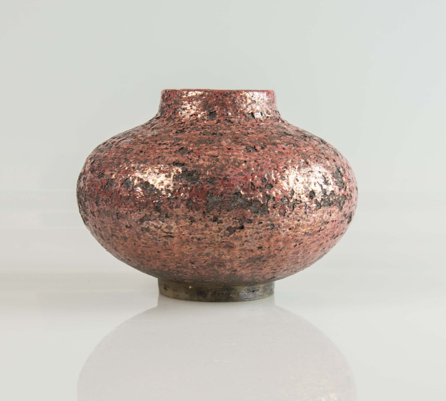 Rund vase i keramik med skinnende krakkeleret glasur i rødlige nuancerDesign af Andegaarden, Blokhus