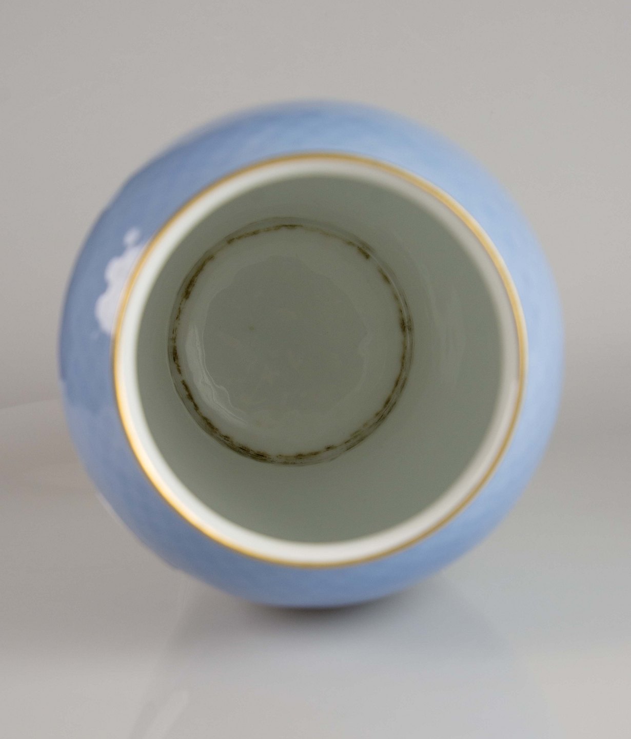 Vase i porcelæn med guldkant og motiv af flyvende mågerProduceret af Bing og Grøndahl Vase nr 203