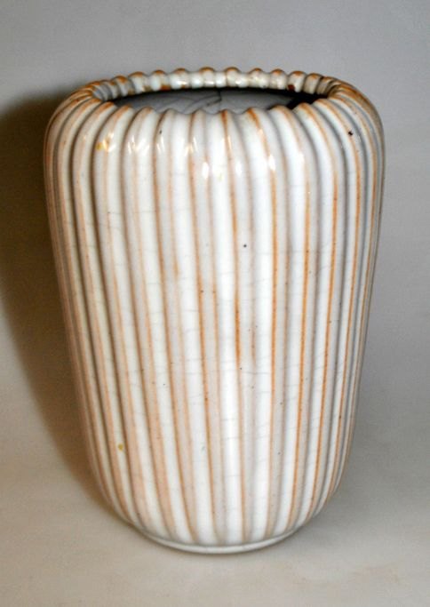 Johansen, Einar (1906 - ) Danmark: Vase. Ler med lys glasur. Riflet. Stemplet: EJO 60. Højde.: 13 cm.Ejo - Keramik efter 1942. København.