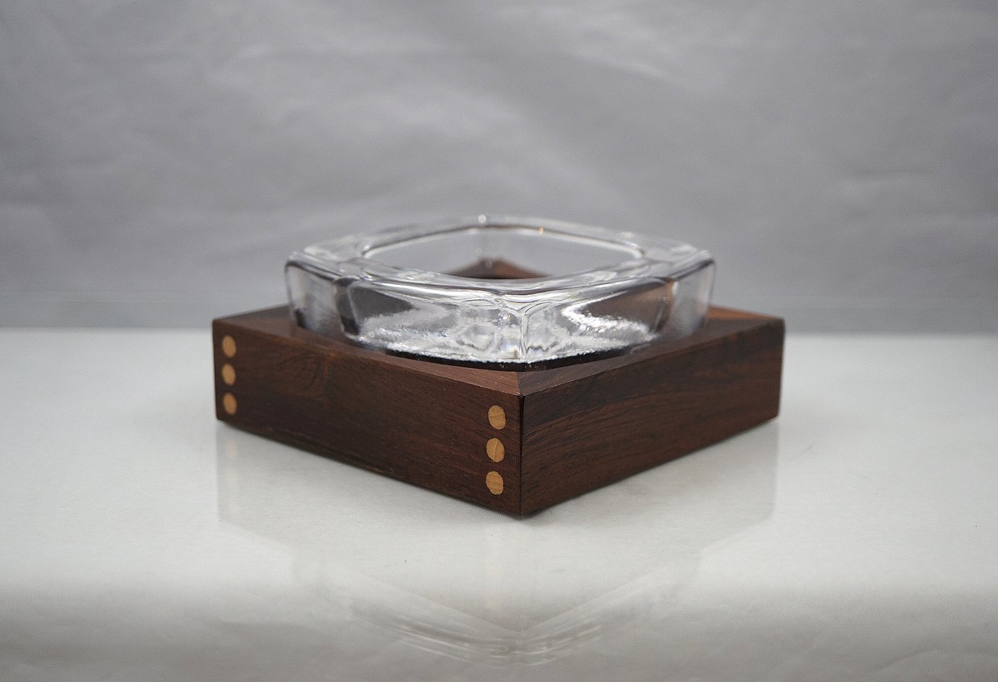 Skruf, Sweden. Tyk glas, med kvadrater i bunden, der står på en ramme af palisandertræProduceret Skruf, Sweden