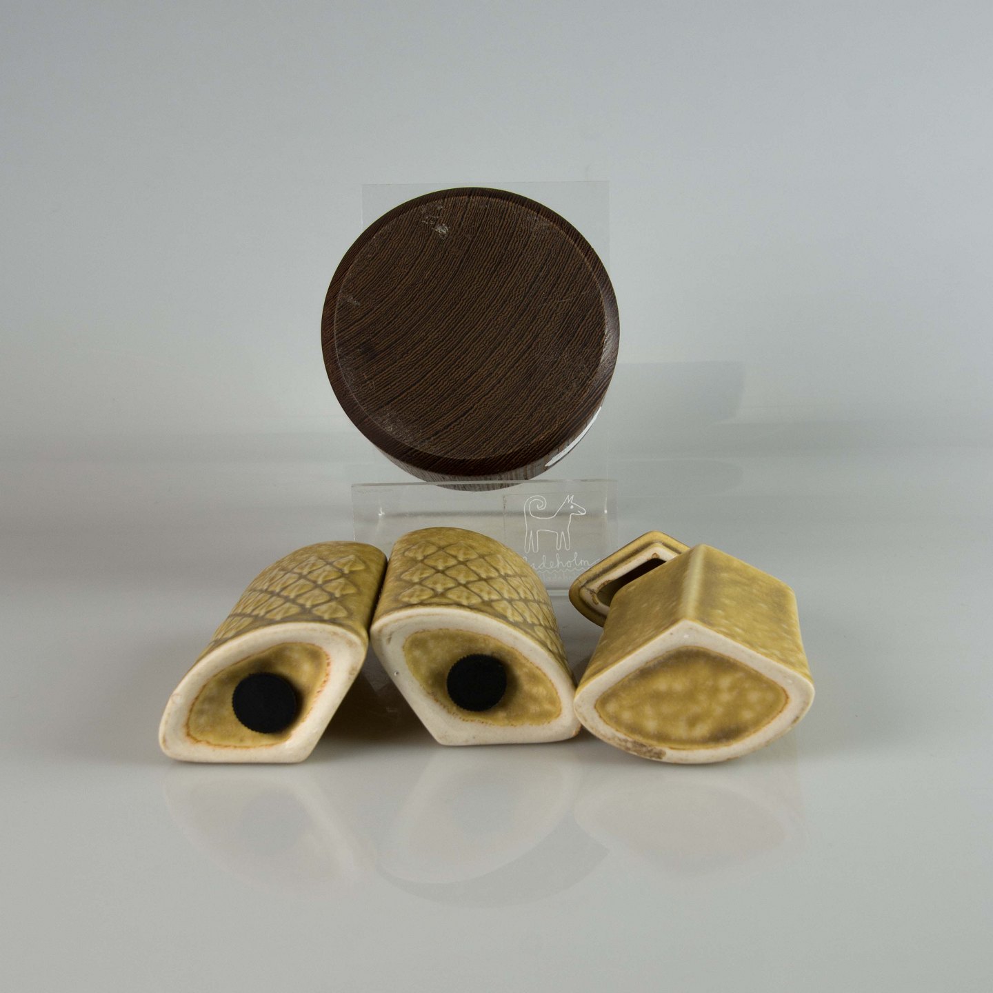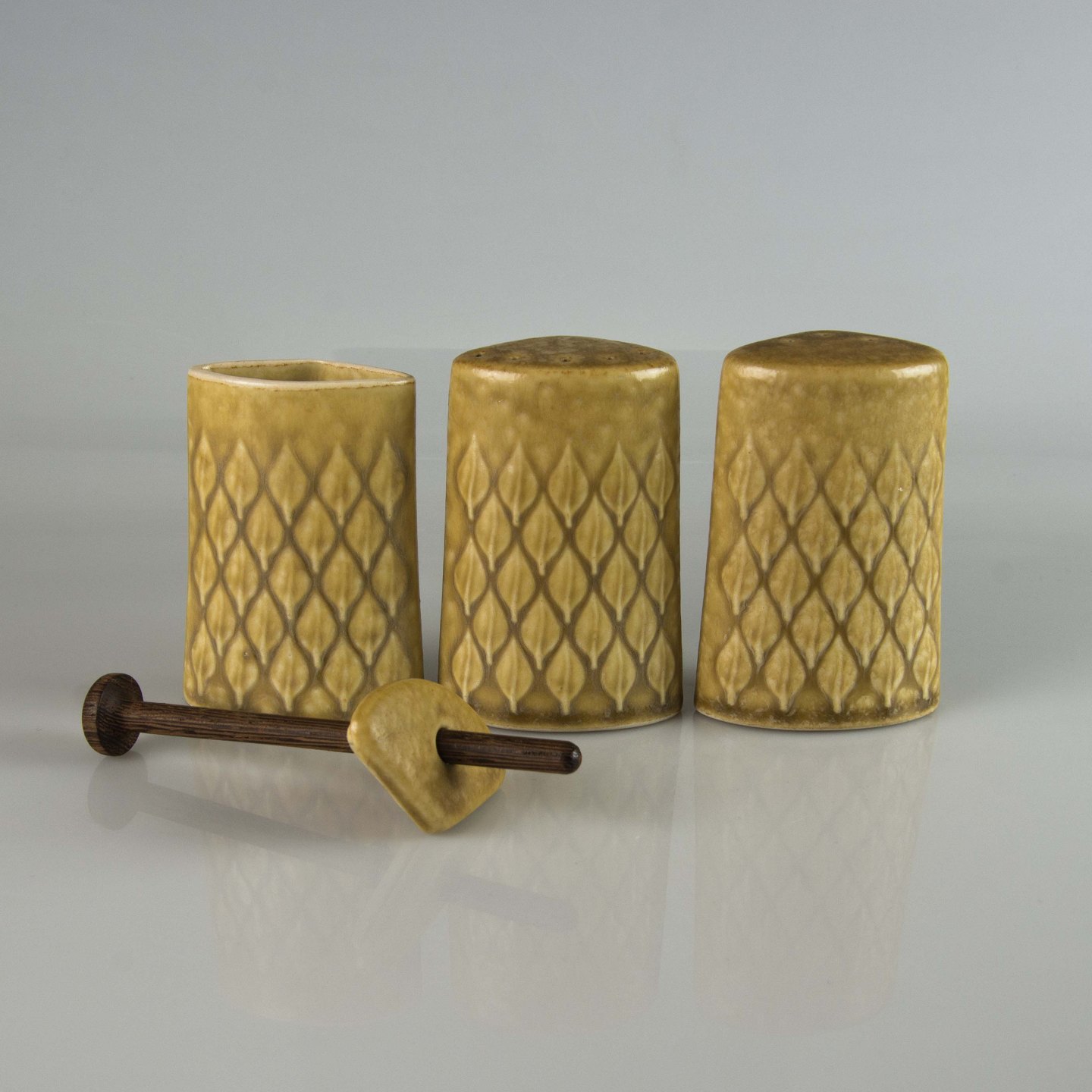 Sæt med saltbøsse, peberbøsse og sennepskrukke i stentøj fra stellet ReliefDesign af Jens Harald Quistgaard