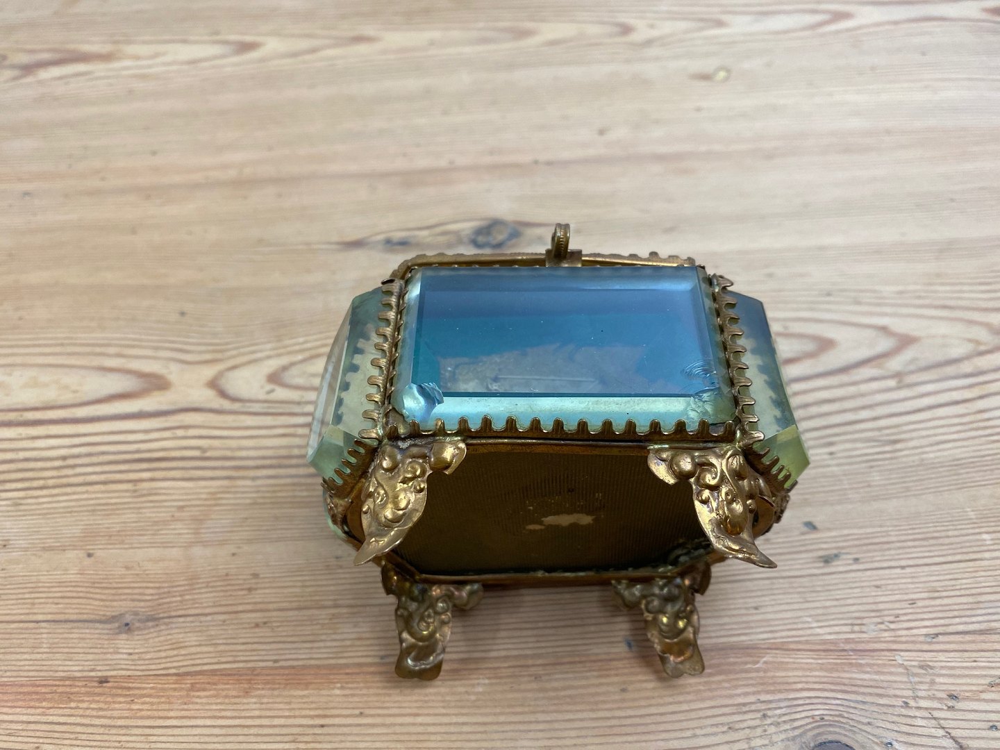 Fin patina og god stand i forhold til alder. Små afslag på glasset flere steder samt skævhed i låget. Åbner og lukker fint.