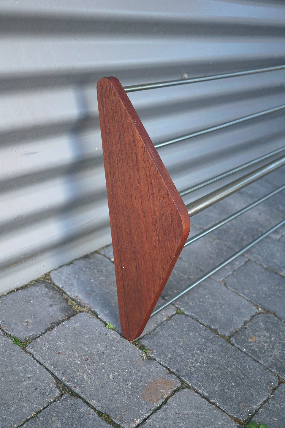 Hattehylde med teaktræs ender og stål bøjlestængerBredde 40 cm, længde 119 cm