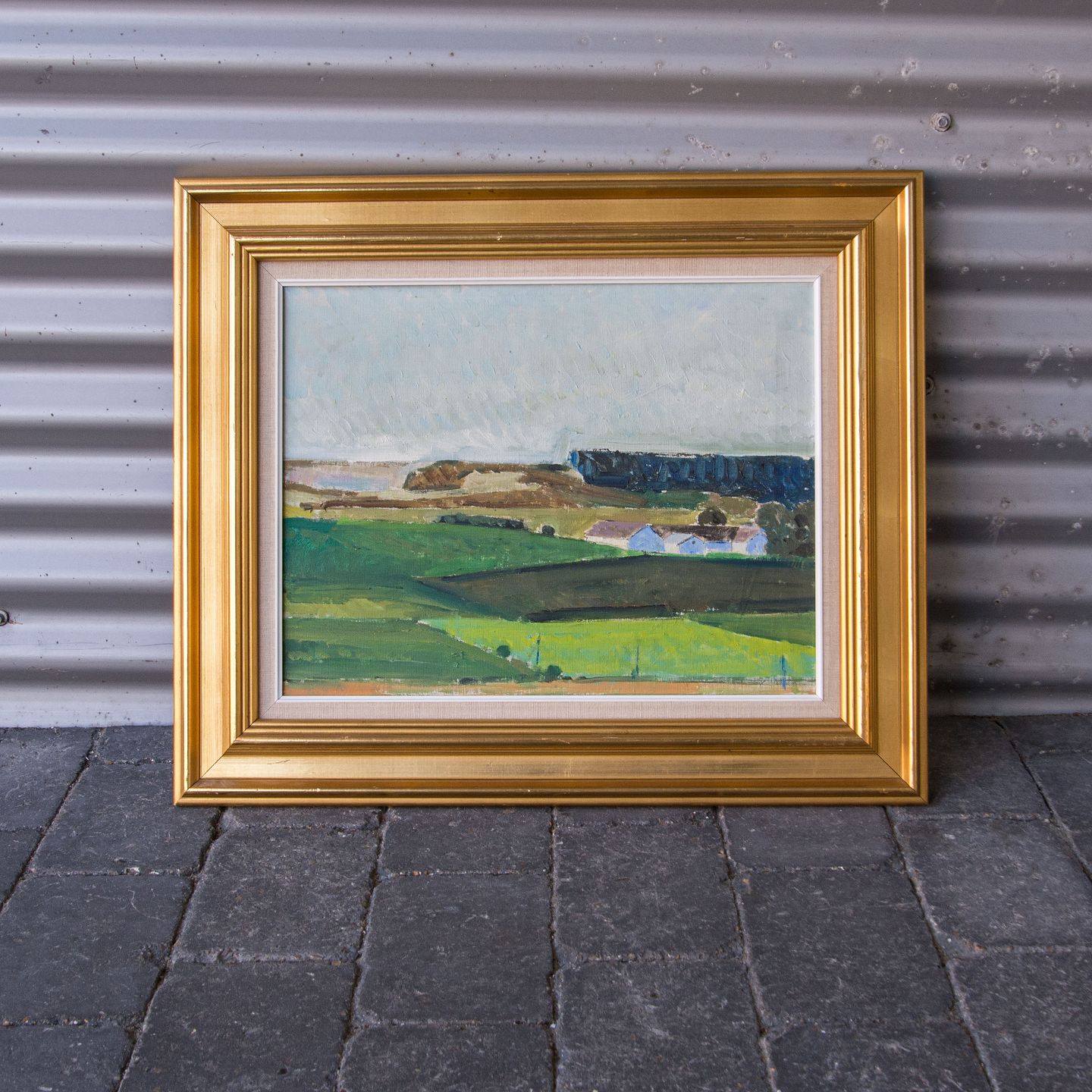 Naturmaleri med motiv af huse sat blandt markerKunstner Erik Olsen født år 1936