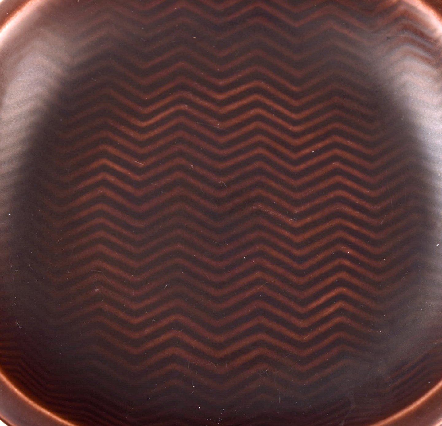 Nils Thorsson for Aluminia. "Marselis" fajance skål med geometrisk mønster i smuk okseblodsglasur. Midt 1900-tallet.Måler: 19 x 4 cm.