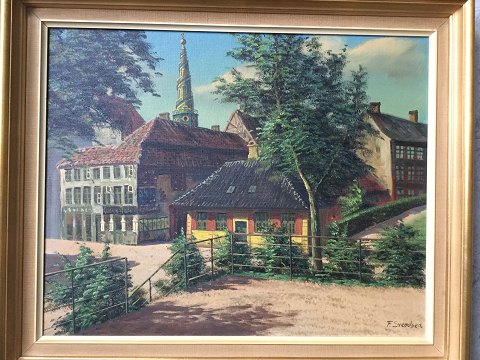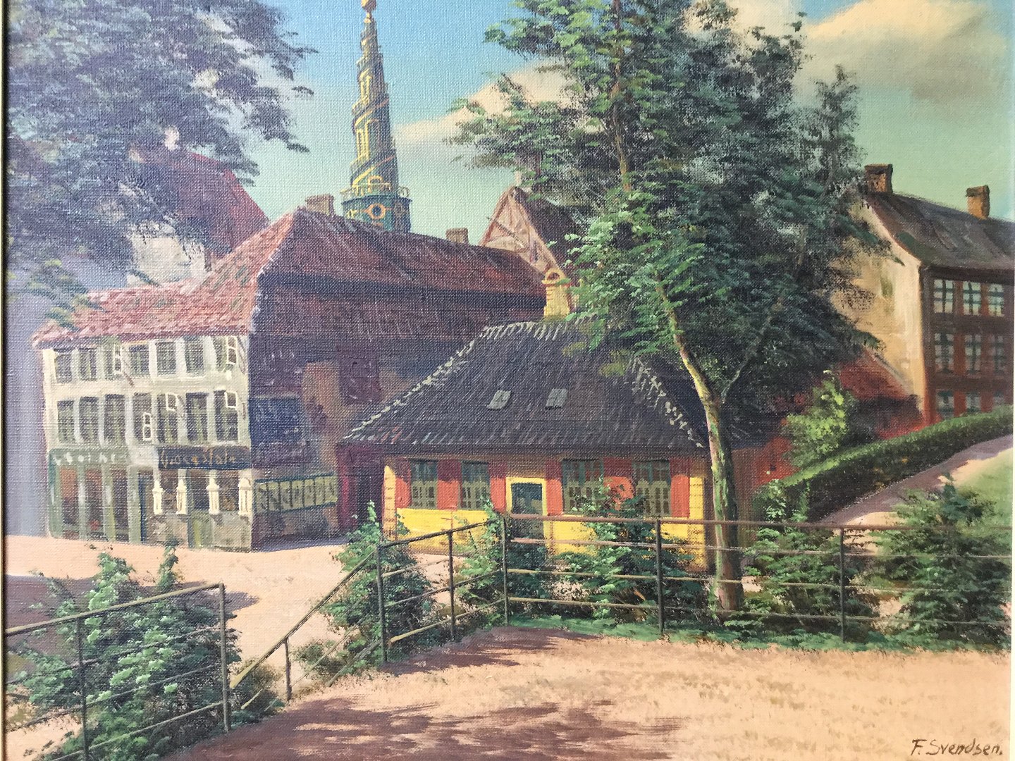 Frederik Svendsen (1885-1975):Parti Christianshavn ved Amager Port og Acciseboden - Ravelinen med Vor Frelsers Kirke i baggrunden.