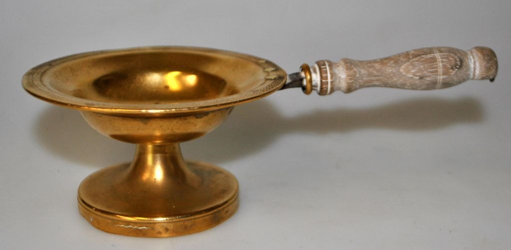 Messing gløde skål med hank, 19. årh. Danmark. Med dekorationer på kanten. H.: 5,2 cm. Dia.: 9 cm. L.: 16,5 cm.Virkelig flot stand!