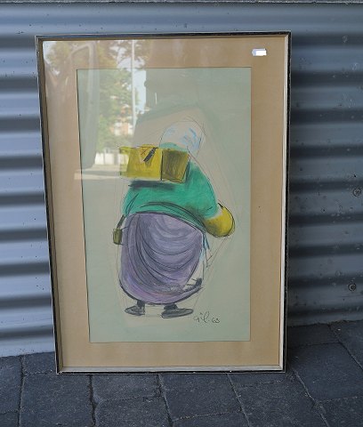 Tegning af Kvinde, set bagfra, der går med en taske på ryggen. Gil 63, karikaturHøjde 67 cm, bredde 46 cm i glas og ramme