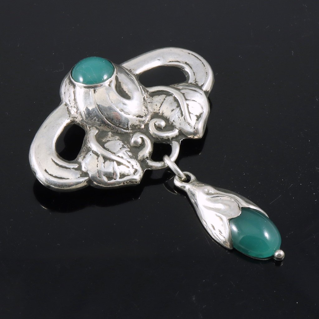 Dansk Skønvirke Broche i Sølv med grøn agat.Stemplet 830S.
