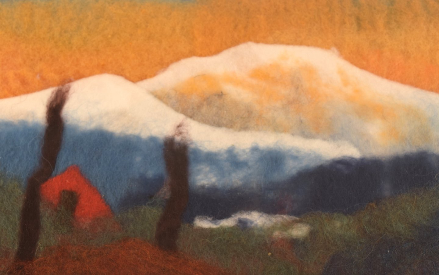 Lisa Johansson, Swedish artist. Wool on board. Modernist mountain landscape with cottage. Late 20th century.The board measures: 66 x 33 cm.