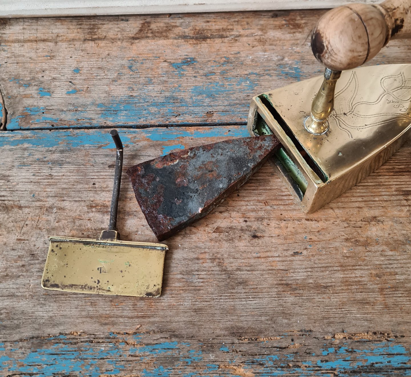 Messing strygejern anno 1850, dekoreret med tulipan samt årstal 1850.Fremstår stemplet.