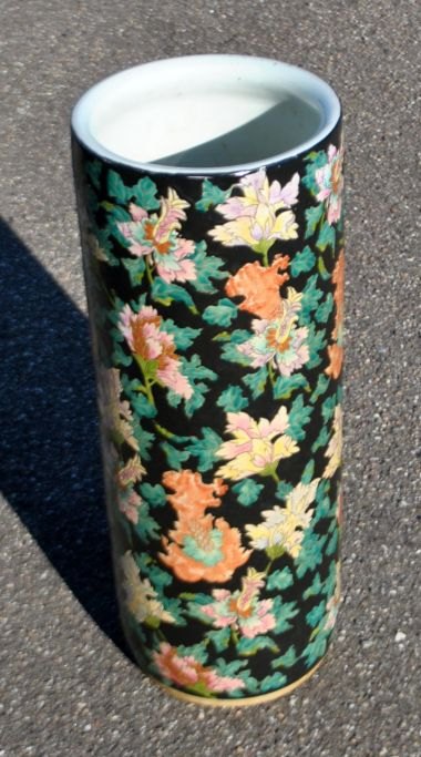 Kinesisk paraplystativ i porcelæn, 20. årh. Famille noire. Dekoreret med blomster. H.: 62 cm. Dia.: 23 cm. Perfekt stand!Emne nummer: 21828