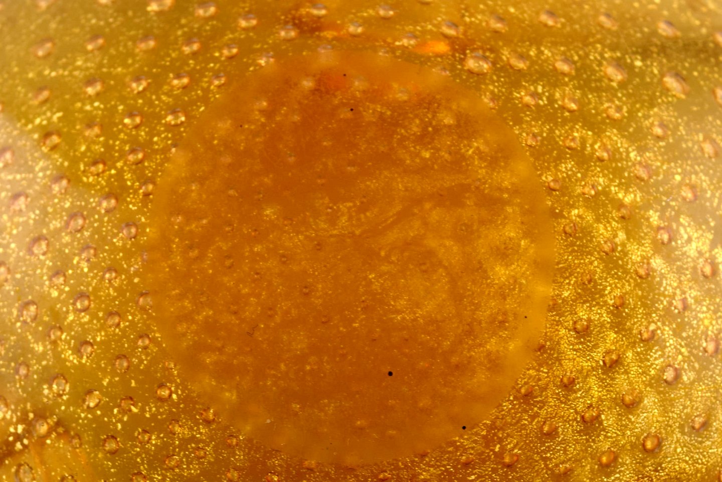 Murano skål i ravfarvet mundblæst kunstglas med indlagte luftbobler. Italiensk design, 1960'erne.Måler: 16,6 x 6,5 cm.