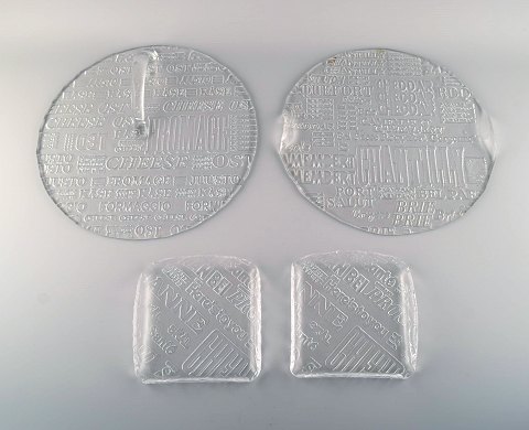 Swedish glass art. Two cheese platters with cheese names and two bowls in art glass. 1980's.The dish measures: 31.5 cm.