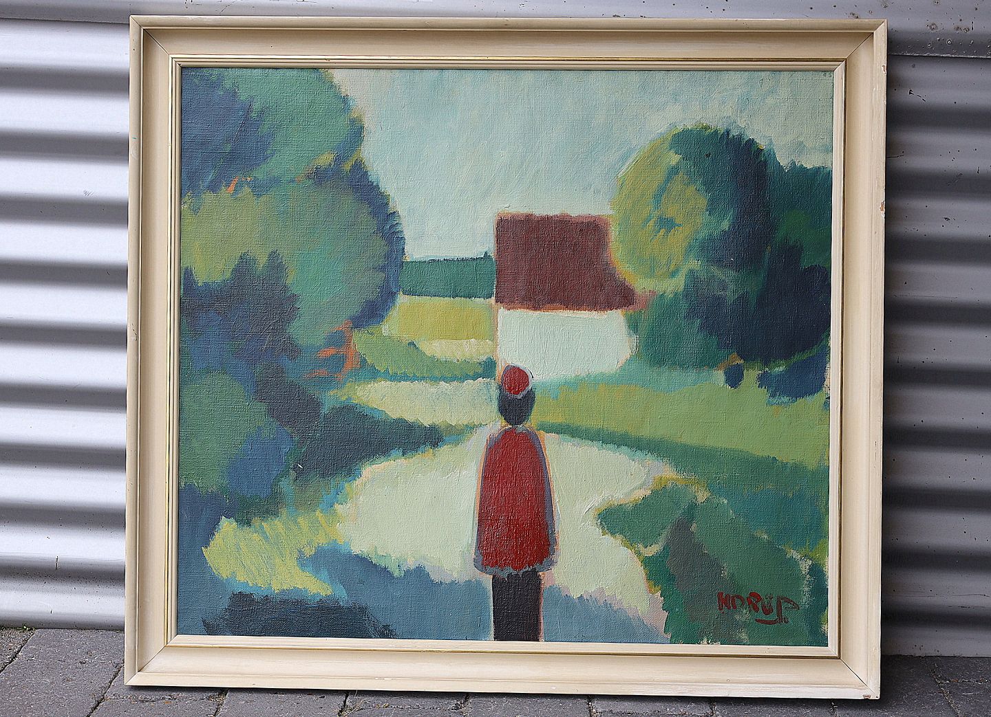 Kunstmaler Knud Horup. Maleri. Dreng, der går ad markvej, hen mod lade. Signeret HorupDer er enkelte brugsspor