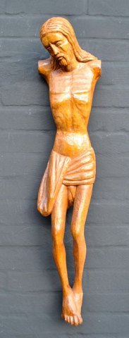 Petersen, Thorvald (1899 - 1988) Danmark: Kristus. Udskåret egetræ. H: 85 cm.Figuren fremtræder uden arme.