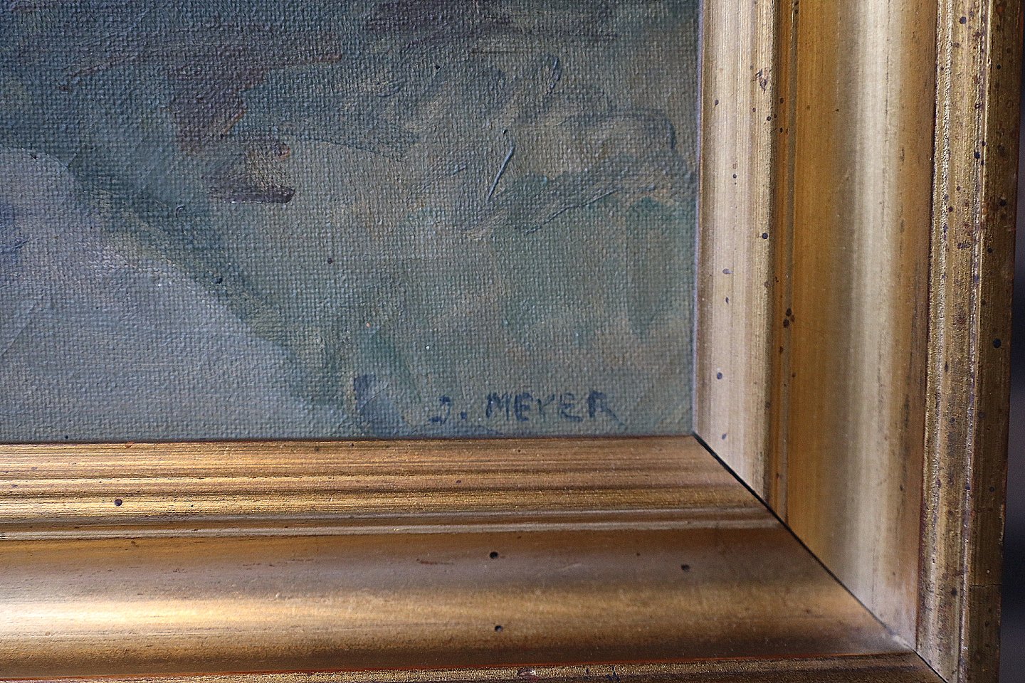 Maleri, Jacob Meyer (1985-1971). Kig ud over en Allé med 2 døde træer og 1 postkasse. Maleriet er signeret J. Meyer. Maleriet er i guldramme, rammen har enkelte brugssporHøjde 43,5cm.