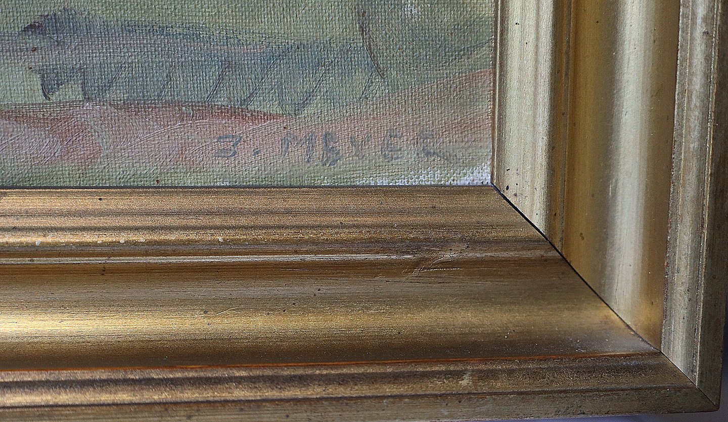 Maleri, Jacob Meyer (1985-1971). Landskab med himmel og marker, der ligger en hvid gård midt i maleriet. Maleriet er signeret J. Meyer. Maleriet er i guldramme, rammen har enkelte brugssporHøjde 43,5cm.