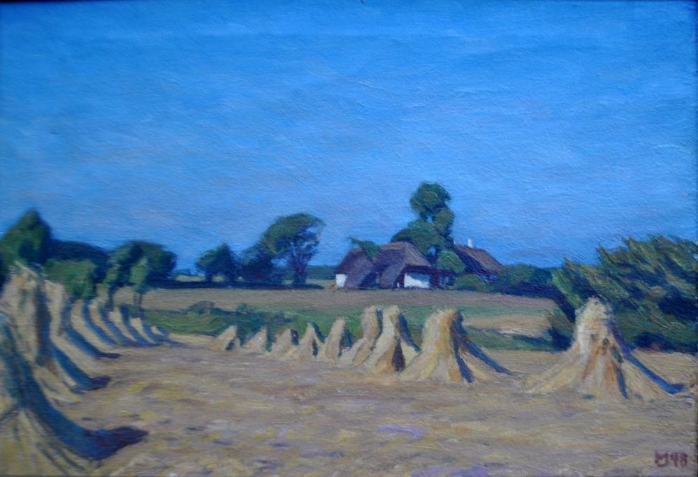 Hindevad, Peter Marius Jensen (1885 - 1977) Danmark: Korntraver på en mark. Signeret 1948. Olie på lærred. 42 x 62 cm.Indrammet.