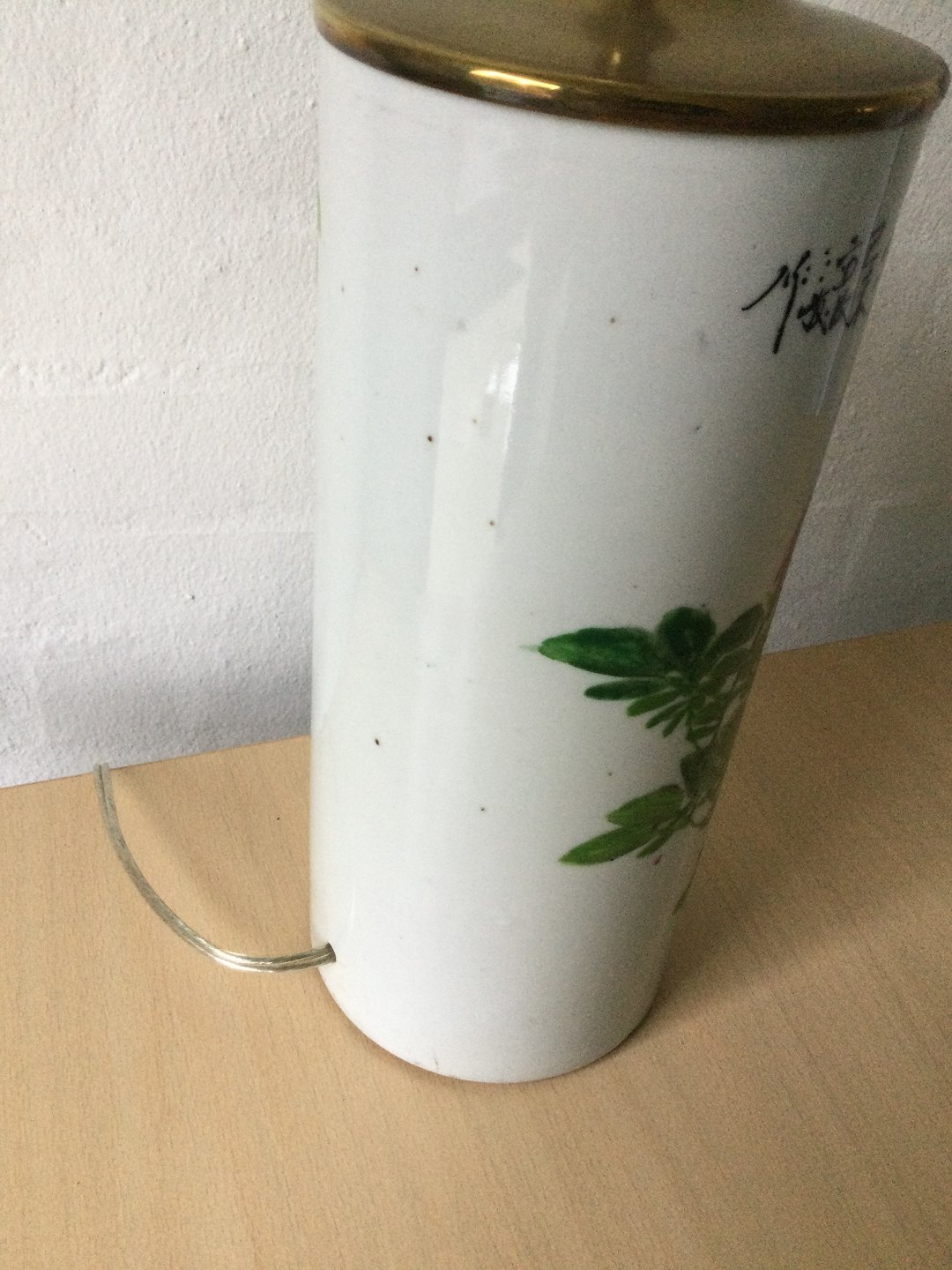 Polykromt dekoreret med blomster, fugle samt skriftstegn.