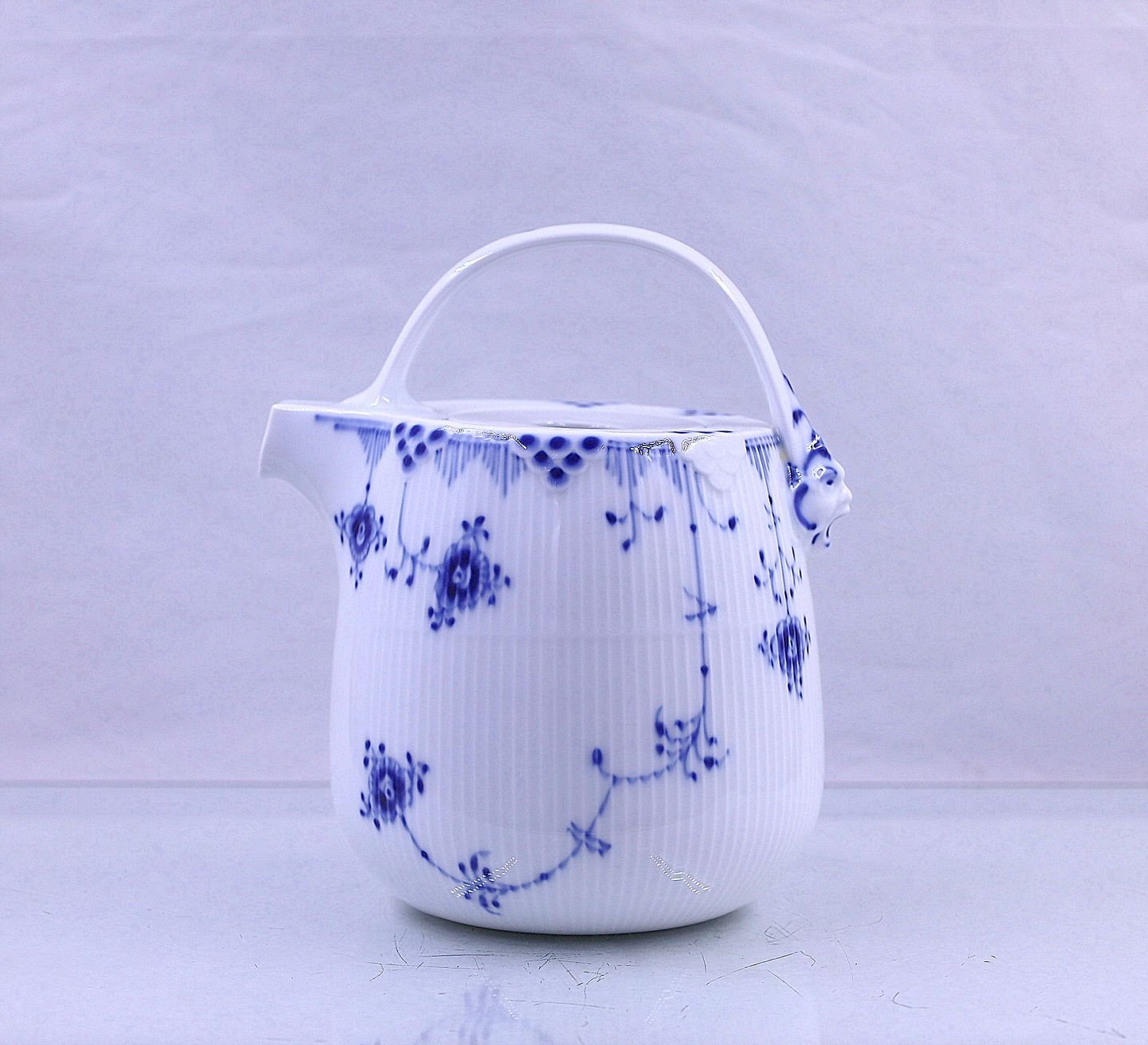 Royal Copenhagen. Tekande nr. 142, låg nr. 143. Blå Elements tekandeSom en lille detalje er hanken udsmykket med en dekorativ grotesk, som også er kendt fra Royal Copenhagens originale stel. På indersiden af låget er der en dekorativ snegl, som gør det nemt at tage tekandens låg af og på.