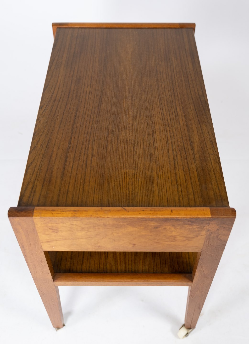 Lille sidebord med skuffe i teak af dansk design fra 1960erne. Kommoden er i flot brugt stand.H - 60.5 cm, B - 63.5 cm og D - 39 cm.